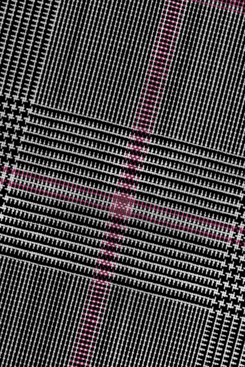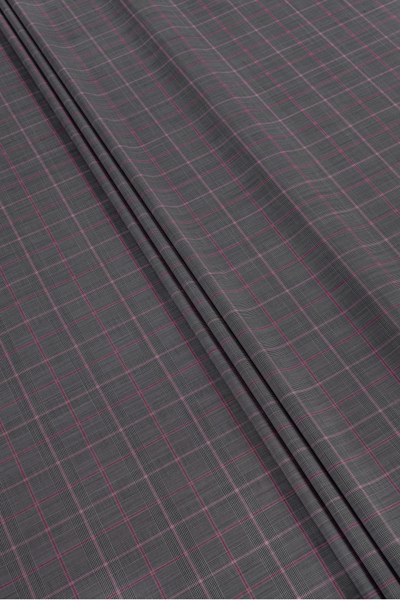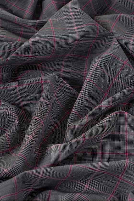 Laine de costume italien en gris et noir avec un motif à carreaux roses (3,5 cm). Tissu doux d’une épaisseur classique - parfait pour coudre un costume, une robe, une jupe ou un pantalon.