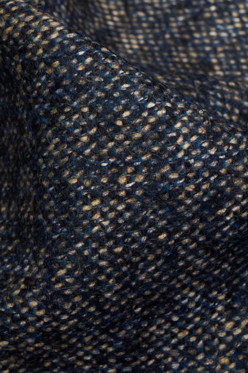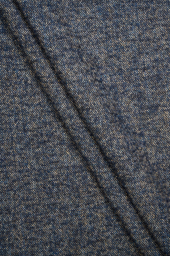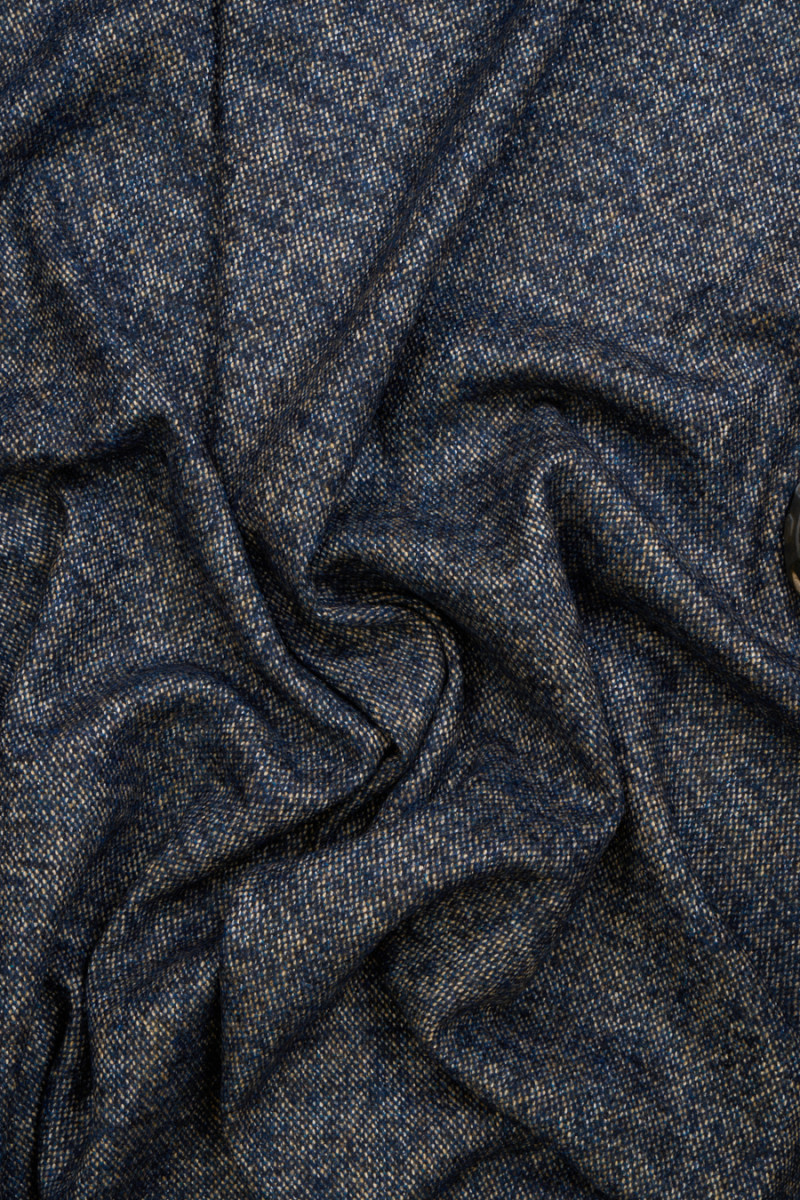 Tissu de costume italien mélangé dans les couleurs bleu marine, écru, beige et gris. Tissu plus épais, de type automne-hiver, inélastique mais doux travaille, tissé principalement à partir de fibres naturelles, dont la laine, qui apporte de la chaleur. Une proposition intéressante pour coudre un costume, une jupe, un pantalon et un manteau fin.