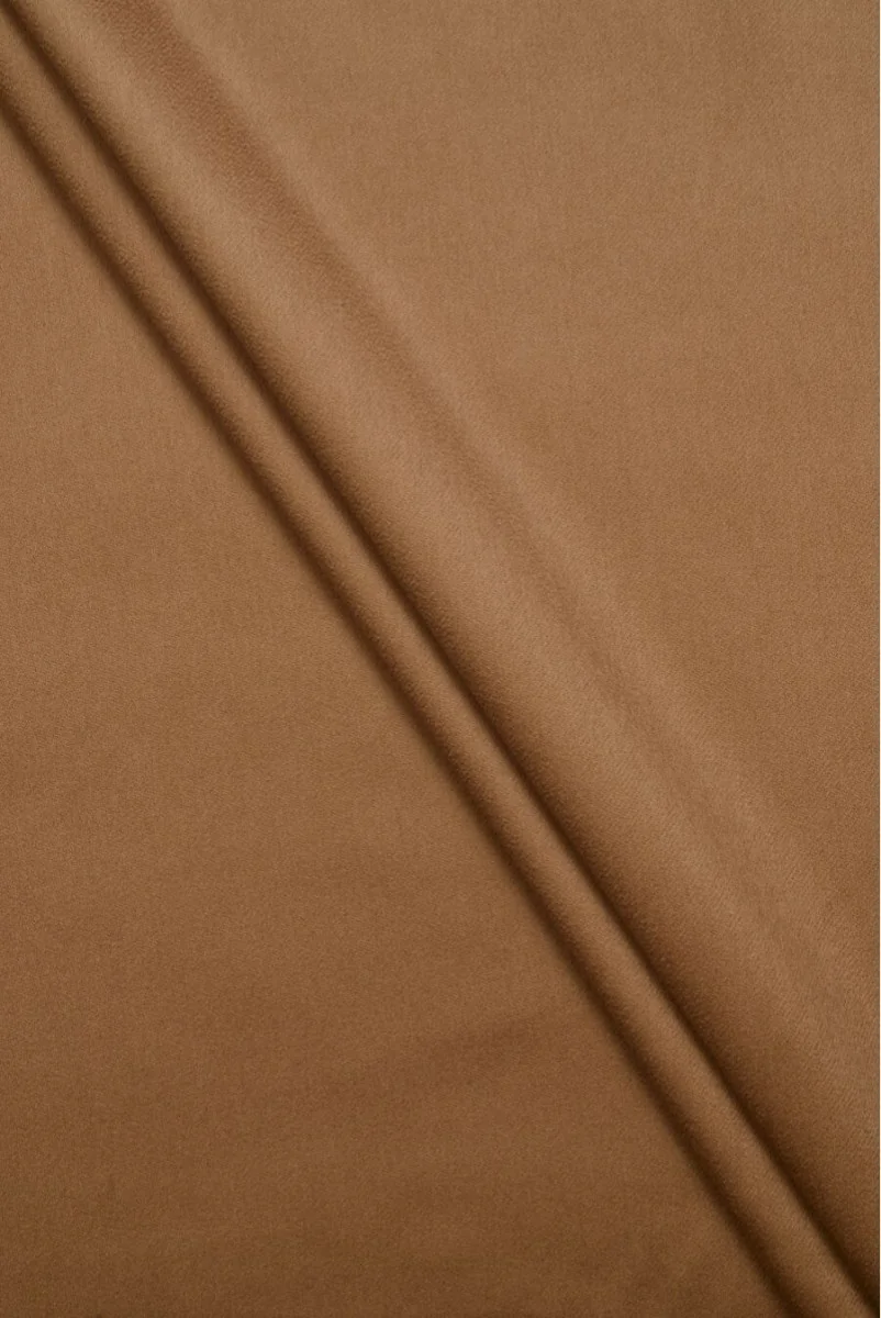 Tissu de costume tissé à partir de laine naturelle et de cachemire de couleur camel. Le tissu est charnu, doux, mat, inélastique et réalisé dans un tissage sergé légèrement visible. Une proposition parfaite pour les vêtements d’hiver de tous les jours dans une couleur neutre et intemporelle. Il fonctionnera bien pour coudre une jupe chaude, une robe, ainsi qu’une veste.