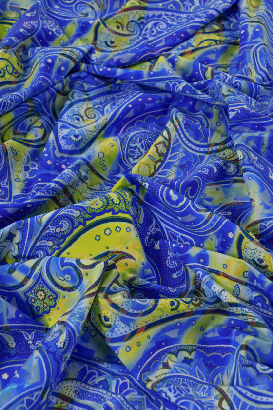 Tissu tricoté italien en lycra élastique bleu bleuet avec une couleur jaune perçante et un motif cachemire oriental. Un tissu au tissage compact et lisse, très élastique - idéal pour les personnes qui aiment les vêtements moulants et les motifs orientaux. Il est parfait pour coudre des vêtements de tous les jours ainsi que des maillots de bain, car il est confortable et sèche rapidement.