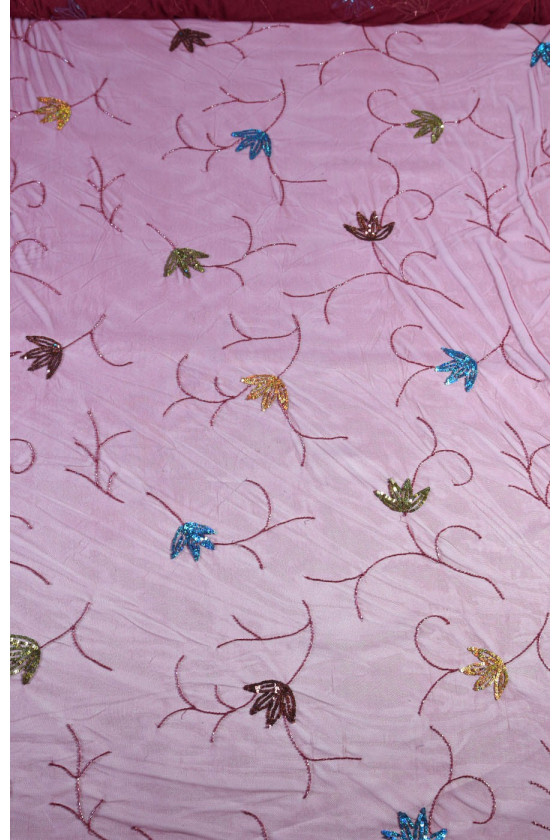 Tissu tulle italien bordeaux avec des fleurs brodées en paillettes et perles colorées.