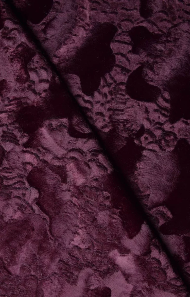 Le manteau de fourrure est de couleur bordeaux, avec des poils courts posés à plat dans différentes directions, ce qui crée des motifs. Le tissu est d’épaisseur moyenne, non élastique et fini avec une légère brillance. Un coupon récent est disponible qui peut être utilisé pour des extras tels qu’une ceinture ou des inserts.