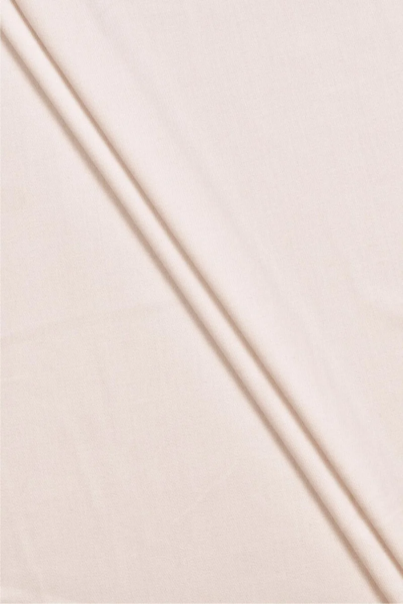 Tissu vestimentaire rose très pâle, tissé en polyester, viscose et élastane. Le tissu est d’épaisseur moyenne, doux et lisse en prise en main, élastique, s’ajuste bien et ne se froisse pas beaucoup. Une bonne alternative moins coûteuse qui remplace la laine pour coudre un costume, une jupe ou un pantalon.