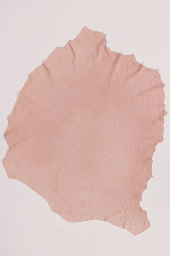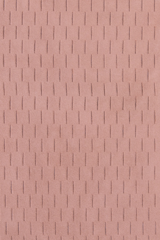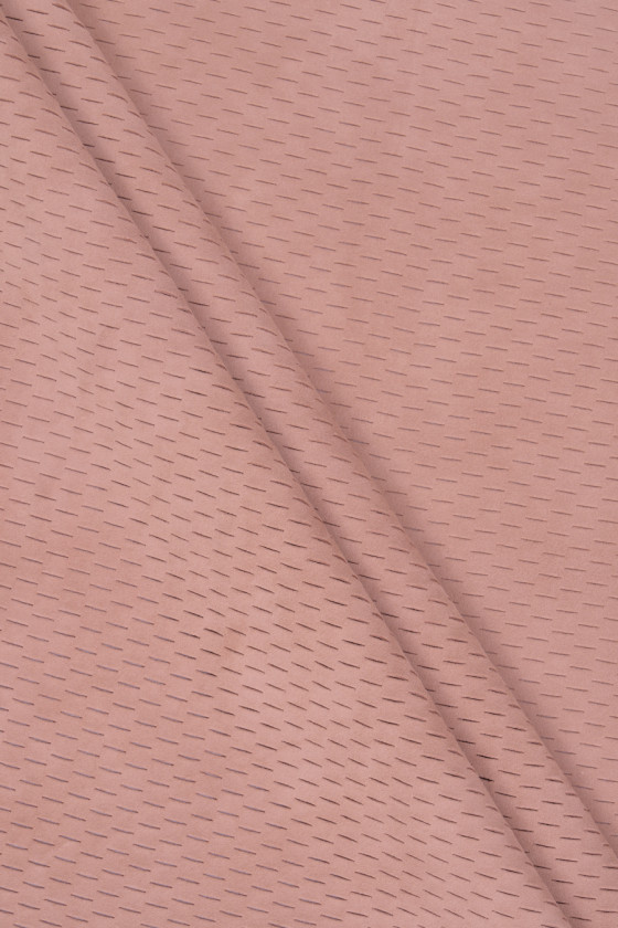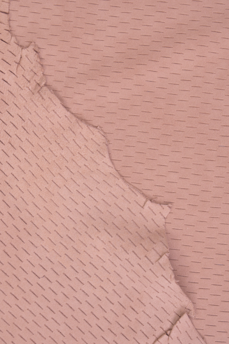Cuir suédé naturel italien de couleur rose poudré. Peau de chèvre avec motif découpé au laser de coupes fines, très douce et délicate. Il est parfait pour coudre une robe, une jupe, une veste ou même un chemisier.
