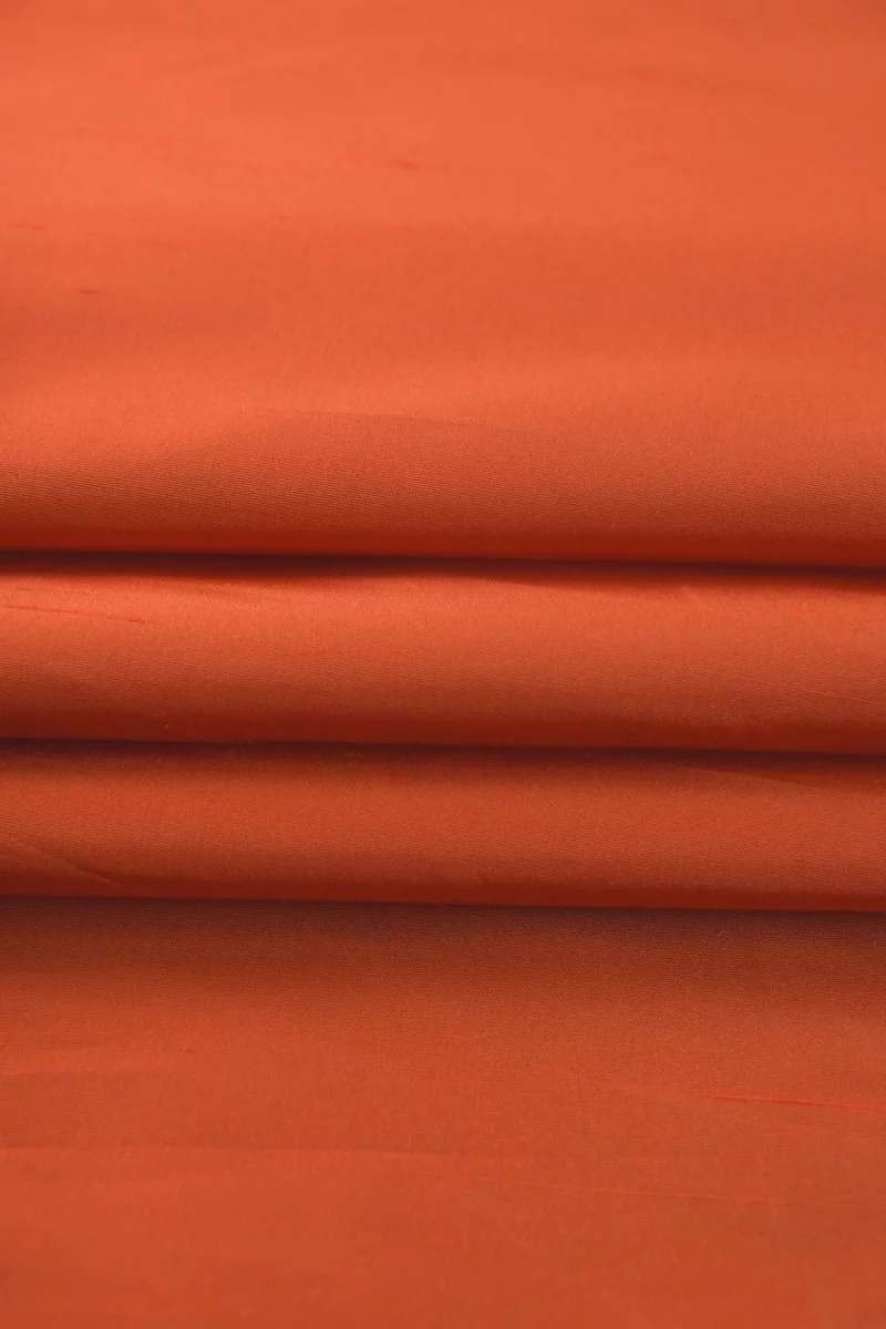 Tissu shandong italien 100 % soie tissé à partir de deux couleurs de fils : orange et beige, qui créent un effet bicolore. Tissu avec de légers épaississements.