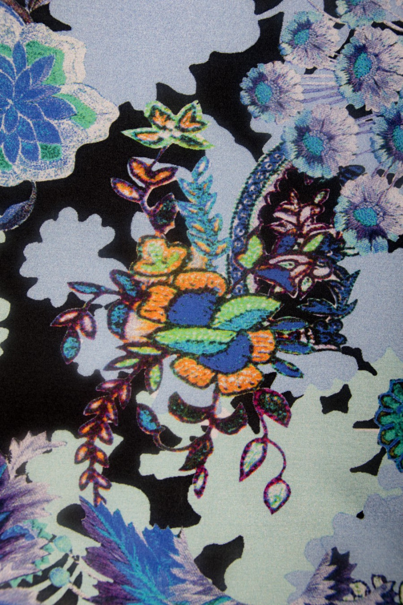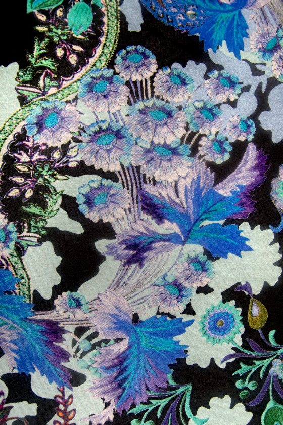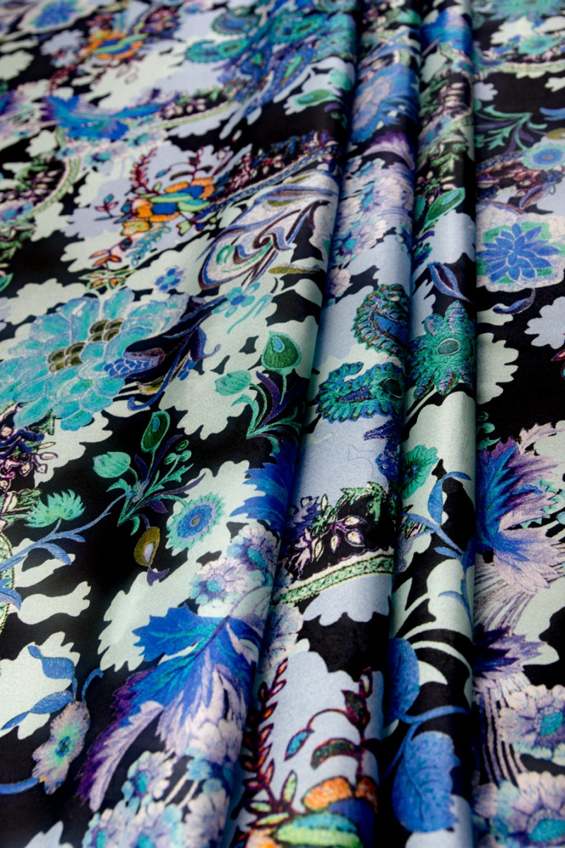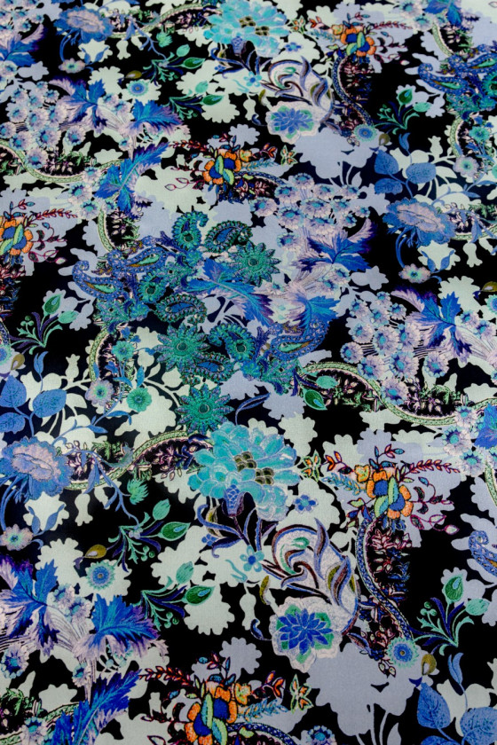 Crêpe de soie élastique avec un motif floral et des feuilles orientales. Aux couleurs bleuet-orange-menthe, c’est un tissu délicat, fin (légèrement transparent), semi-mat.