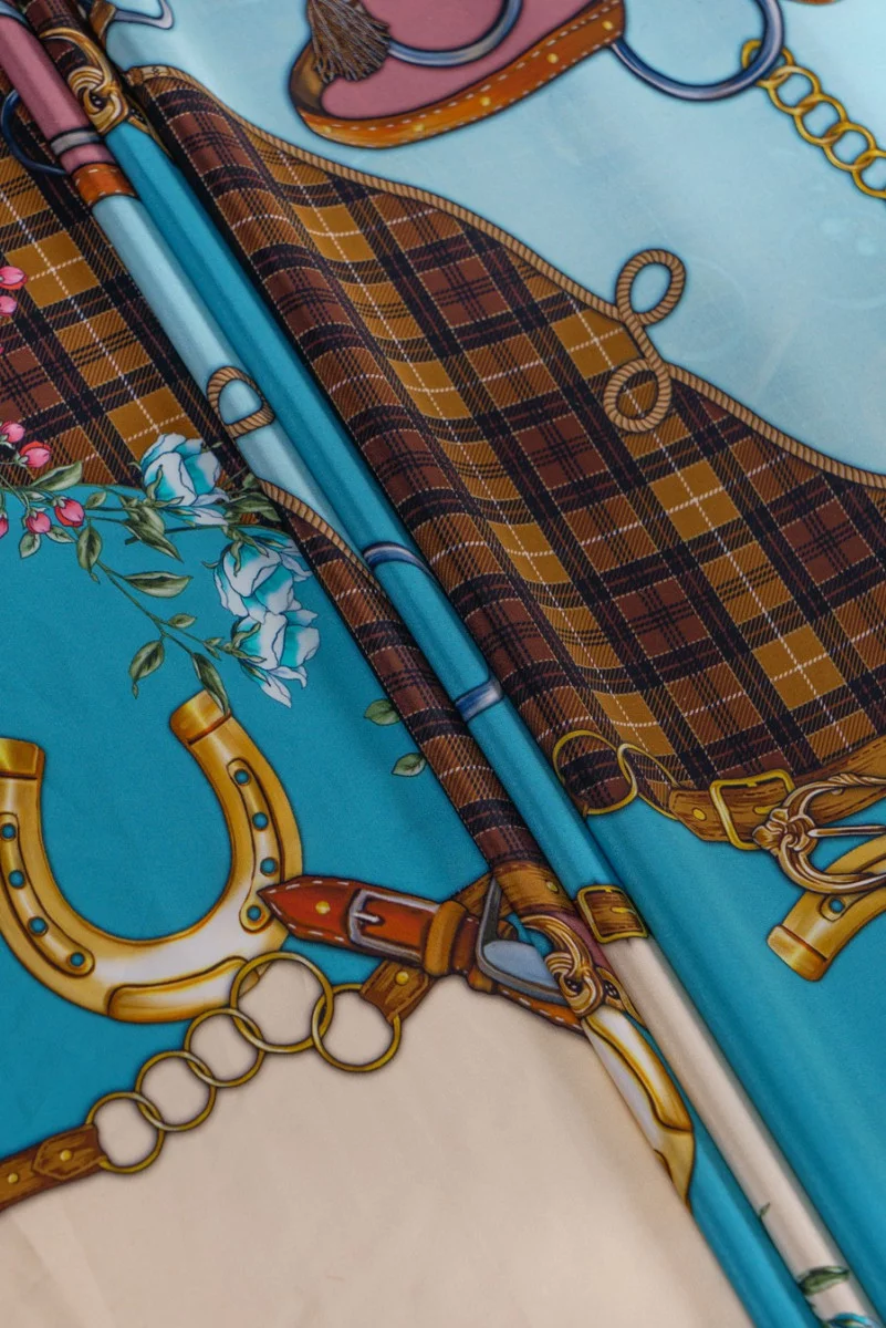 Crêpe en soie italienne avec des motifs intéressants de selles et d’étriers pour chevaux – caractéristiques de la célèbre Fashion House. La crêpe de soie est un tissu délicat, fin et semi-mat. Il peut servir à évoquer des robes légères, des blouses délicates, des foulards, des foulards. Couleurs : bleu, bleu, brun, beige, rose sale