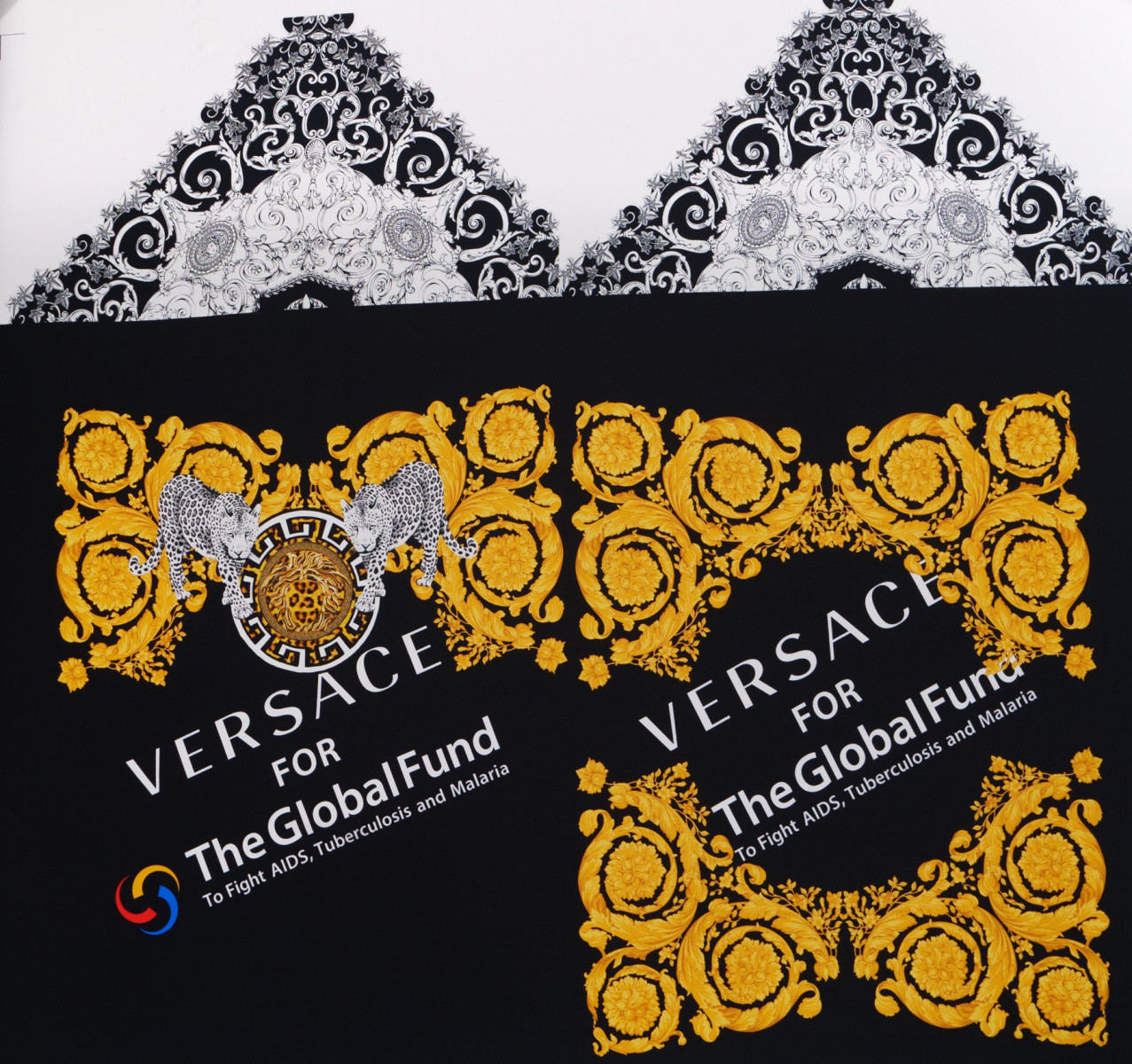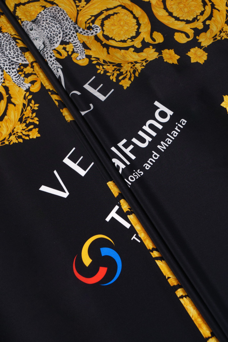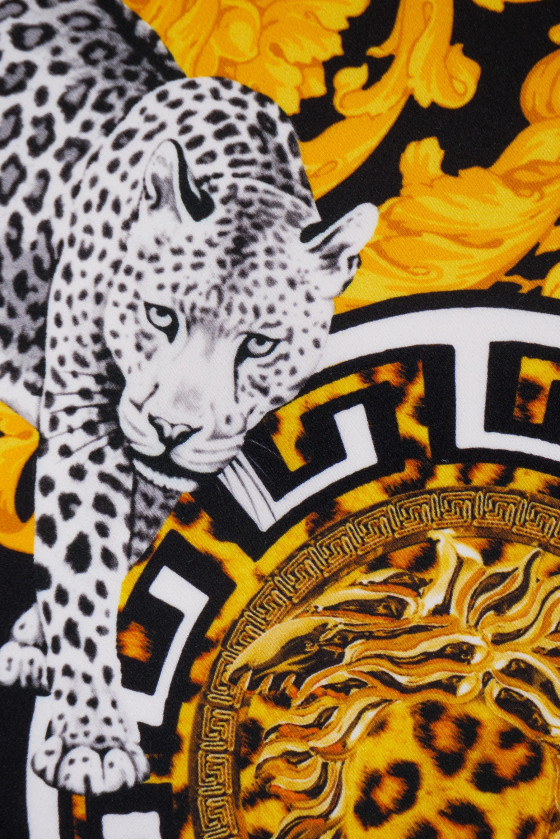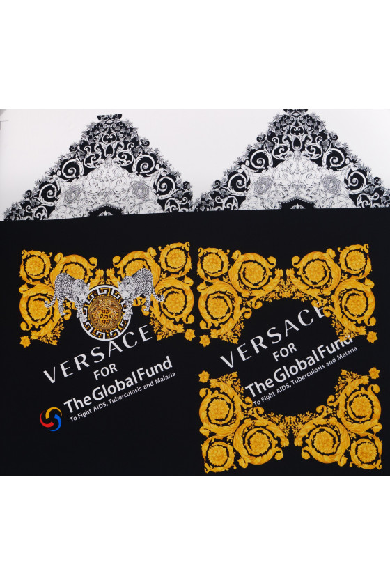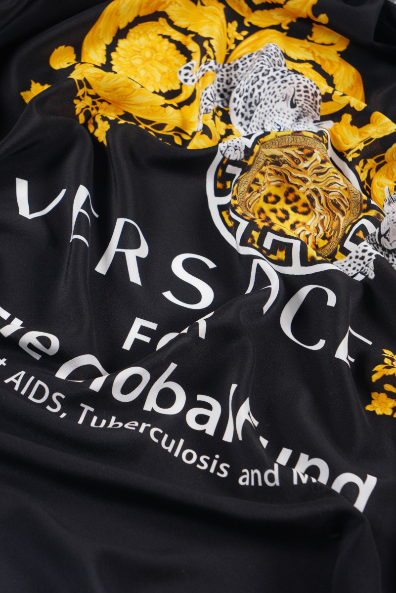 Crêpe italien 100% soie, signé du nom d’une maison de couture bien connue. Motifs dorés et blancs sur fond noir. Le tissu est livré dans un coupon de dimensions de 120 cm * 140 cm, qui se compose de deux éléments (devant et dos, par exemple des chemisiers de 85 cm de long) et de deux manches (34 cm de long).