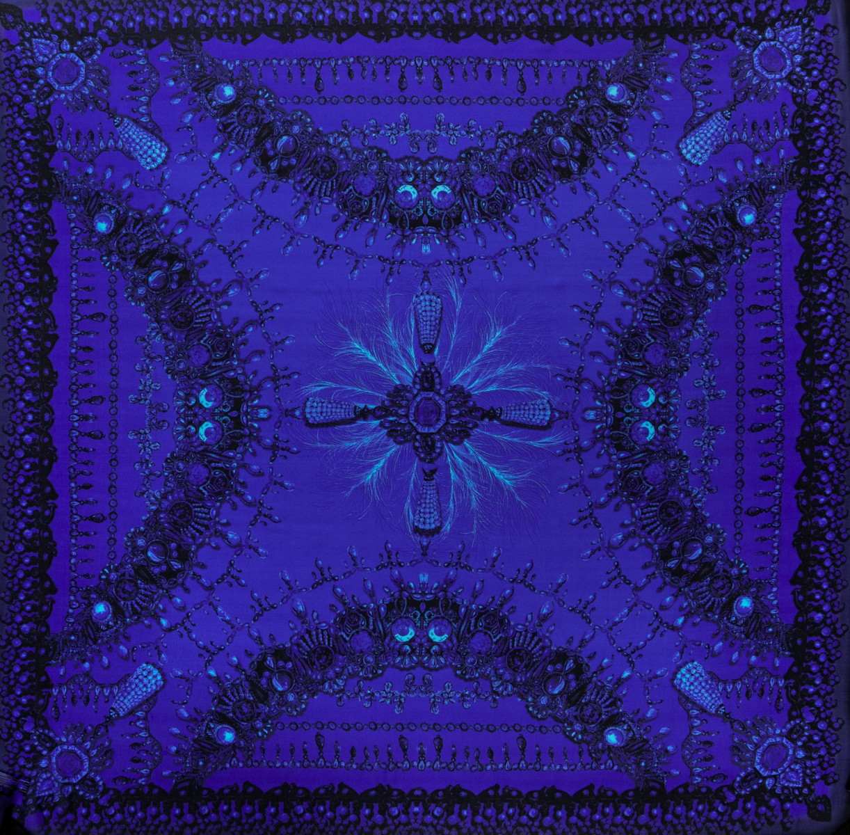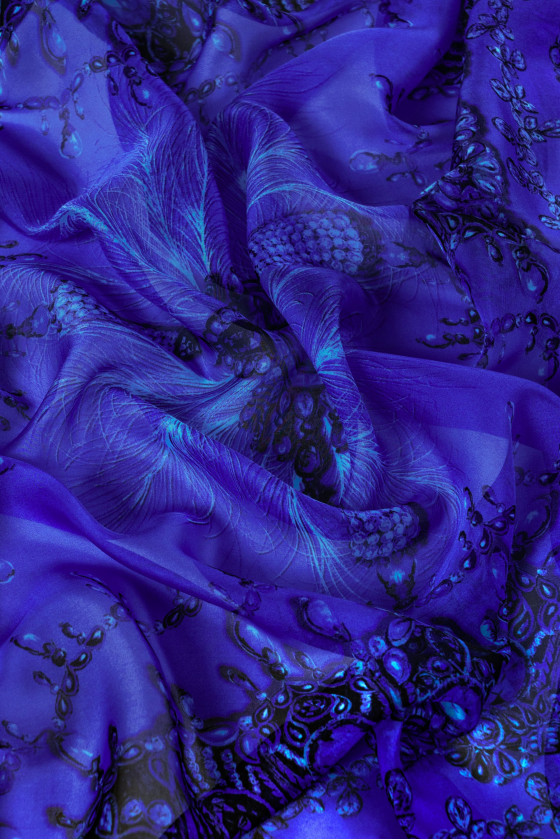 Mousseline italienne 100% soie dans un coupon de dimensions 135 cm* 140 cm. Un beau motif bijou en forme de foulard en noir et bleuet.