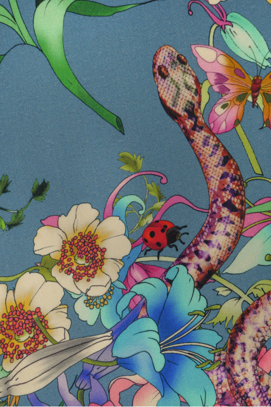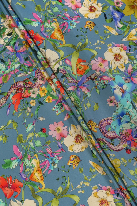 Tissu de robe cadi italien tissé à partir de fibres de soja et de soie naturelle. Un beau motif de fleurs, de papillons et d’un serpent sur fond gris-bleu, le tissu d’un côté est fini par une bordure lisse de 15 cm de large - nous le cousons circonférentiellement.