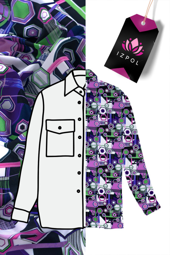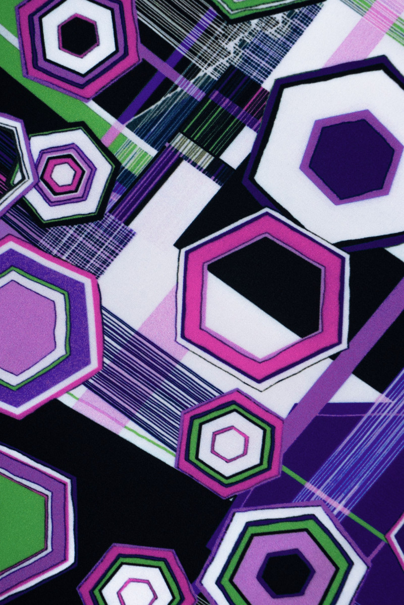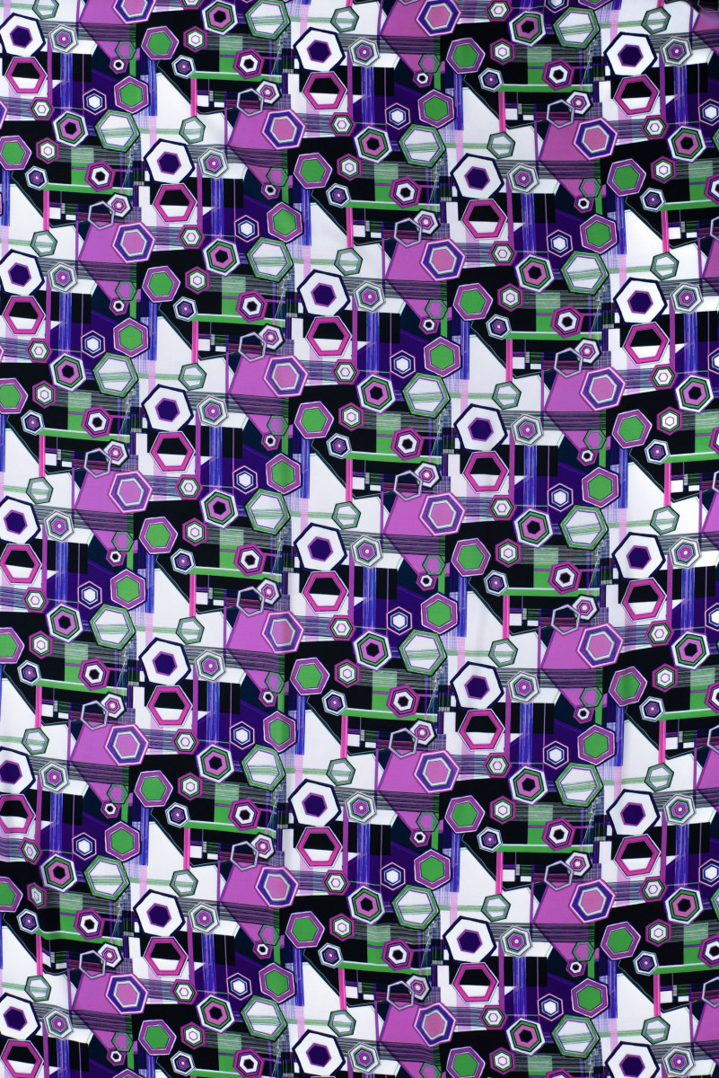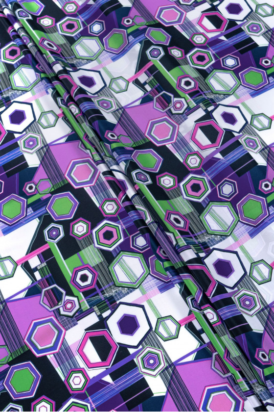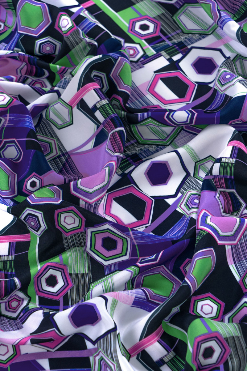 Satin italien 100% soie avec des motifs géométriques de 3 à 7 cm dans les couleurs vertes, violettes et roses - l’imprimé est réalisé sur un côté mat. Le satin de soie est un tissu dense et léger avec une surface plane, fabriqué dans un tissage satiné. Un avantage supplémentaire est sa douceur et sa durabilité, ainsi que le fait qu’il s’adapte très bien, ne se voit pas et est agréable au toucher.