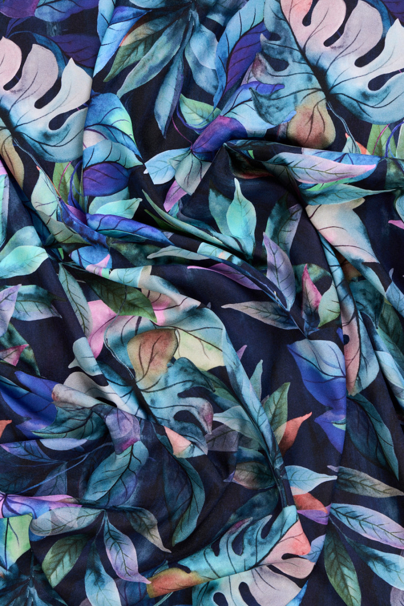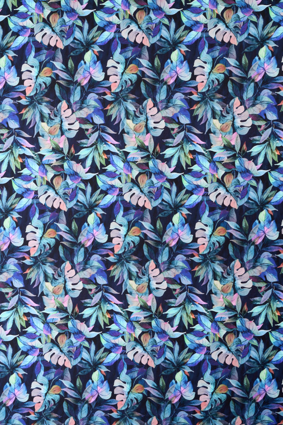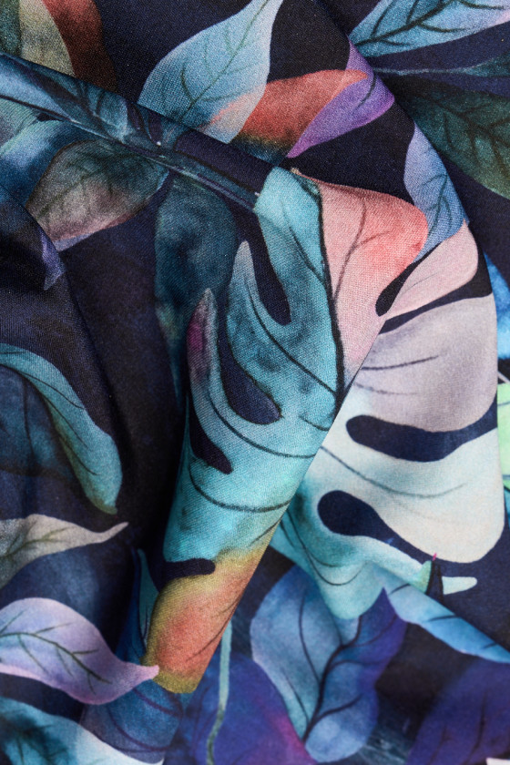 Satin de soie italien avec ajout d’élasthanne avec un motif de feuilles colorées sur un fond noir et bleu marine nuancé. Le motif est réalisé dans des couleurs mer et vertes, magnifiquement enrichi d’accents néon en violet, rose et vert. Le tissu est doux, élastique et s’adapte à merveille. Imprimé sur un côté mat. Il est parfait pour coudre une chemise, une robe ou une jupe originale.