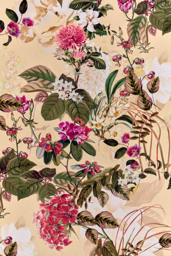 Crêpe italien 100% soie avec un motif floral sur un fond de banane claire. Grands motifs de différentes espèces de fleurs et de feuilles. Le tissu est très léger, aéré, non élastique, fini avec une brillance très délicate. Une proposition unique qui sera parfaite pour coudre un chemisier, une chemise, une robe ou une tunique.