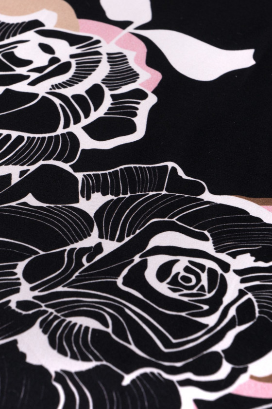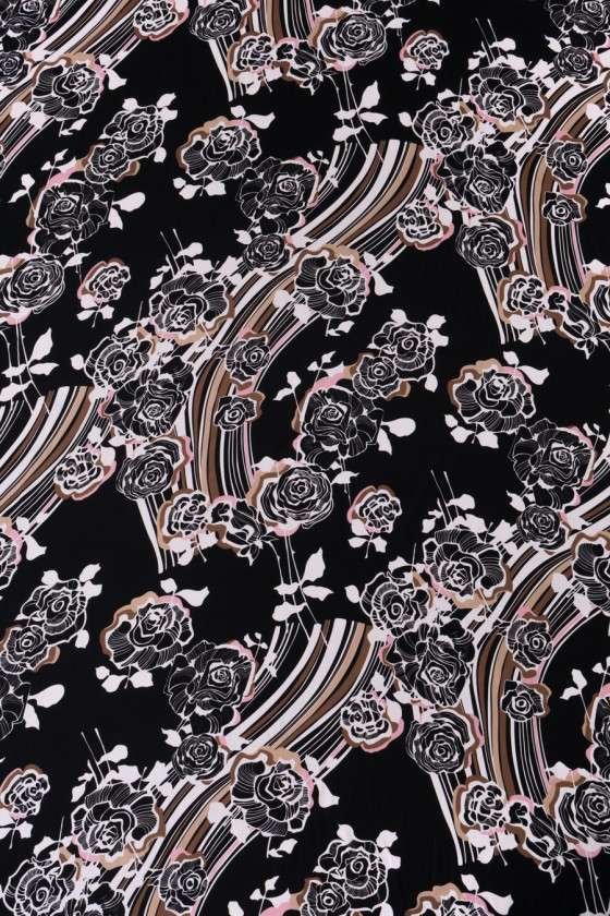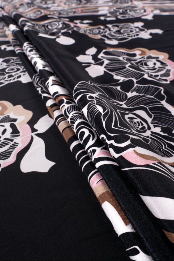 Satin italien 100% soie en noir avec un imprimé dense de fleurs roses en blanc, beige et rose clair. L’ensemble est complété par de larges rayures ondulées dans les mêmes couleurs. Une proposition fantastique pour les personnes qui aiment les motifs floraux aux couleurs sombres.