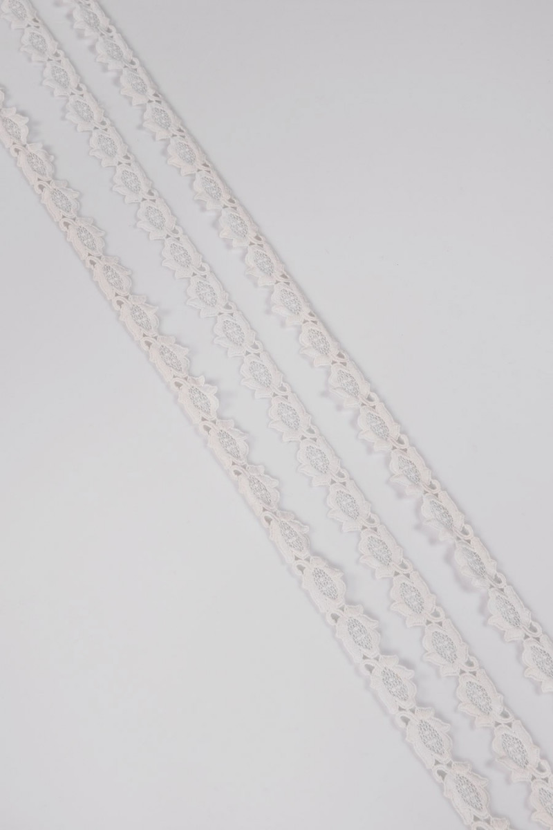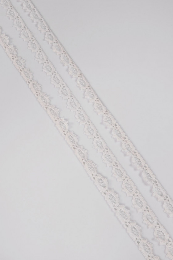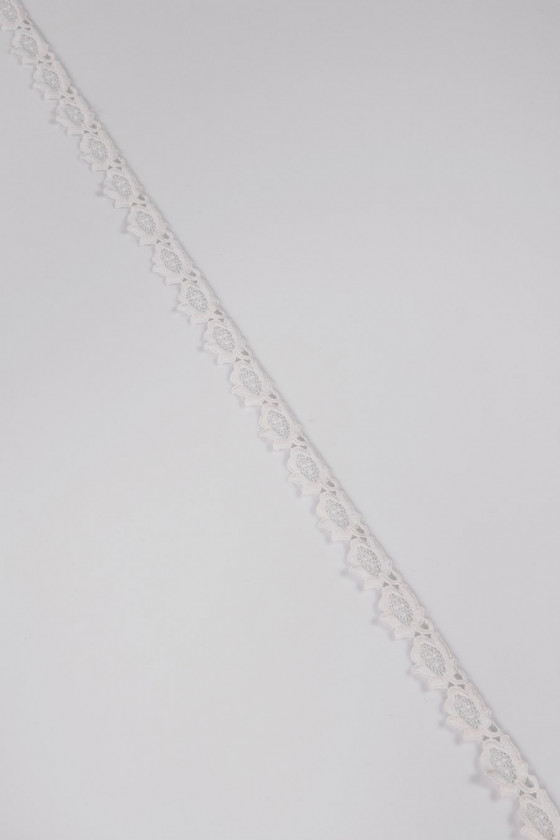 Ruban de mercerie en guipure d’environ 2,5 cm de large pour la finition des robes ou des chemisiers.