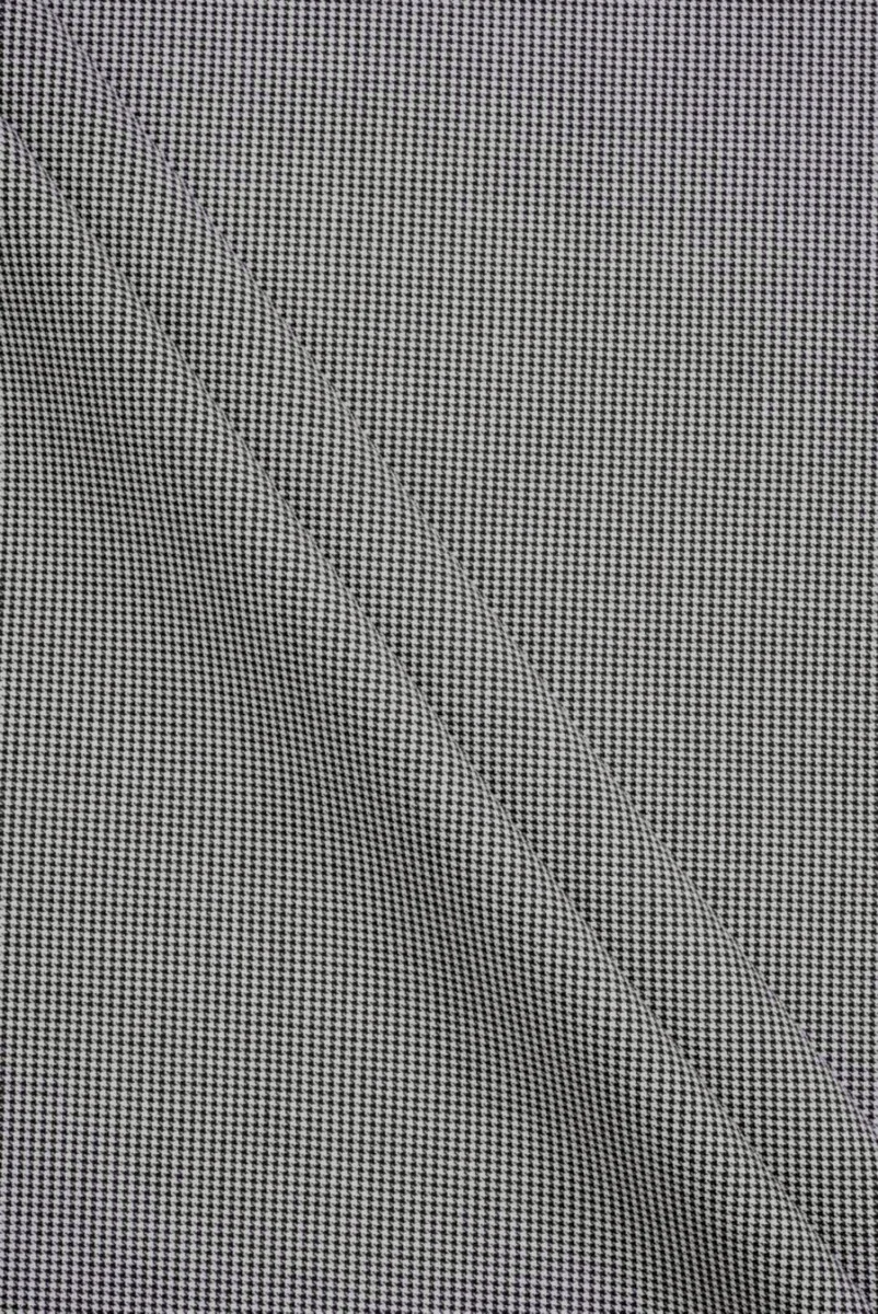 Tissu de costume italien tissé à partir d’un mélange de polyester, viscose et élastane, avec un motif fin pied-de-poule. Le motif est réalisé dans un schéma classique de couleurs noir et blanc, un seul motif mesure environ 2 mm. Le tissu est charnu, doux, élastique et double face – le côté gauche est noir et fait en sergé. Le matériau est parfait pour coudre une veste, une veste ou un costume.