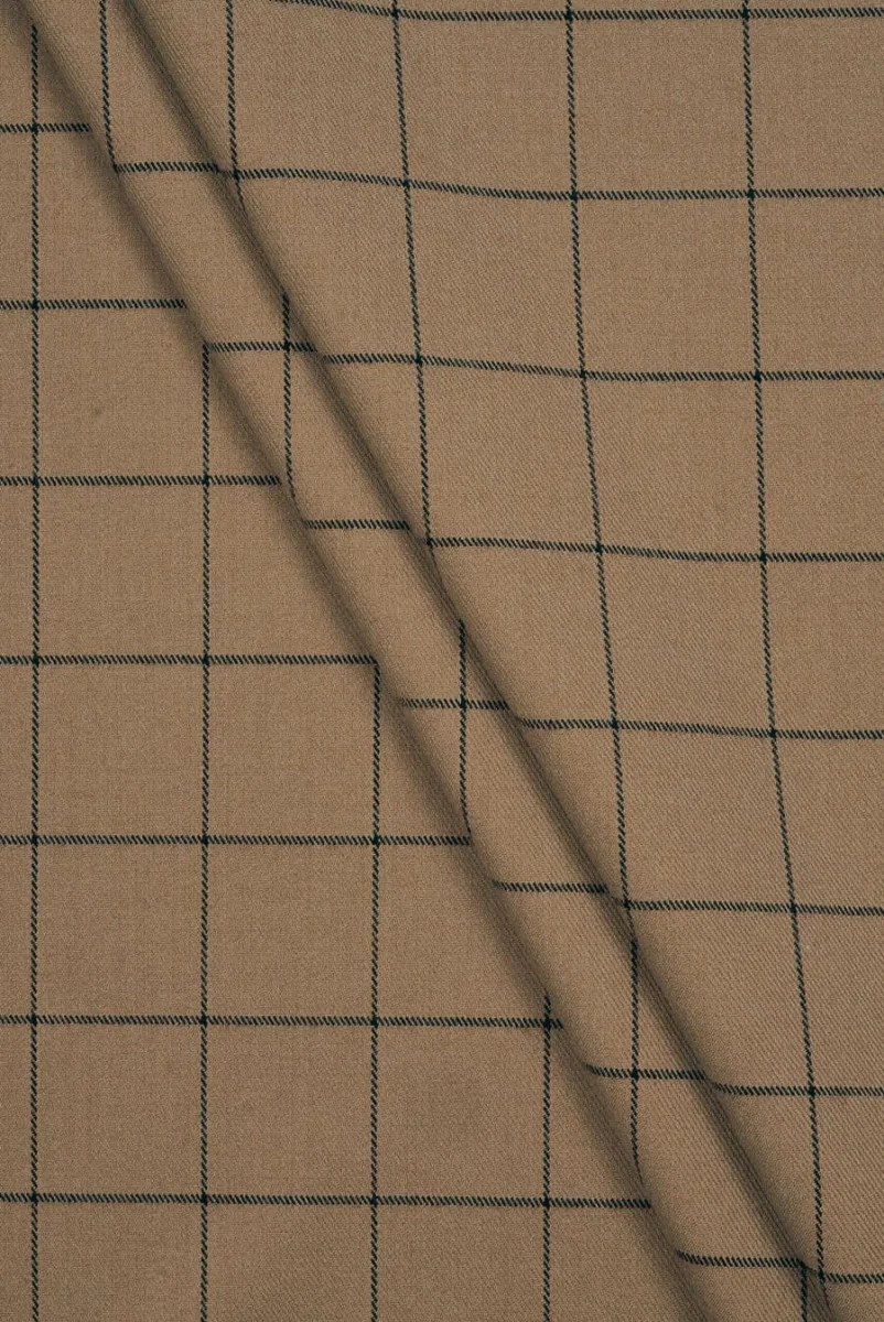 Tissu beige pour costume avec un motif noir à carreaux, tissé à partir d’un mélange de polyester, de viscose et d’élastane. Le réseau unique mesure 4 cm* 4 cm de taille. Le tissu est d’épaisseur moyenne, doux, mat et élastique. Il est fabriqué en sergé. C’est une excellente alternative aux tissus en laine, à partir desquels vous pouvez créer un costume, une robe ou une jupe.