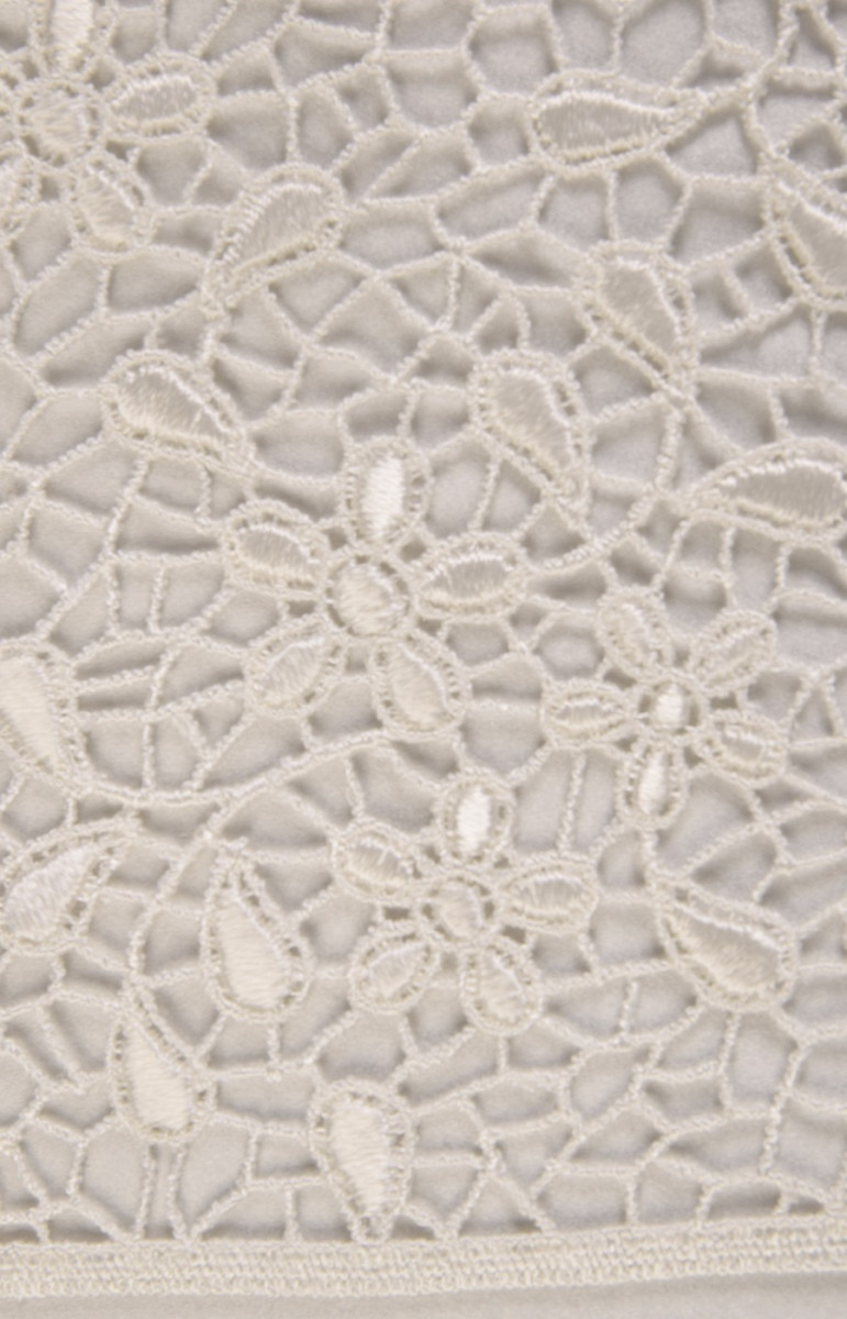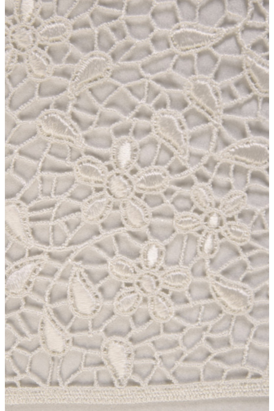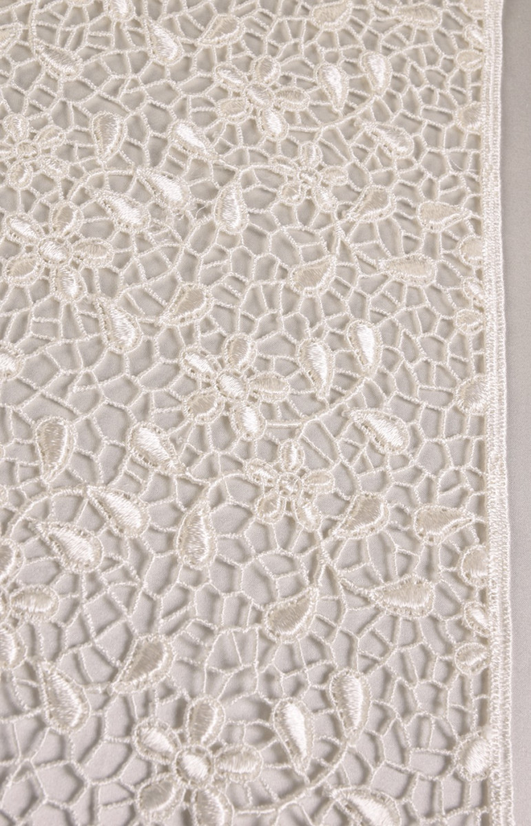 Dentelle guipure densément tissée de couleur écrue avec un motif de petites fleurs et de feuilles. La largeur de la dentelle est de 55 cm.Nous le recommandons pour coudre des robes élégantes, des chemisiers, pour des inserts et des passementeries et comme tissu décoratif.