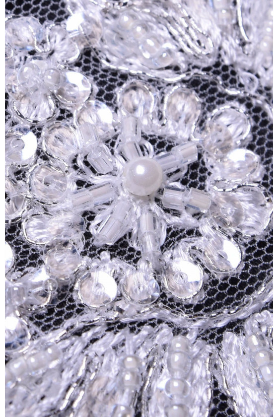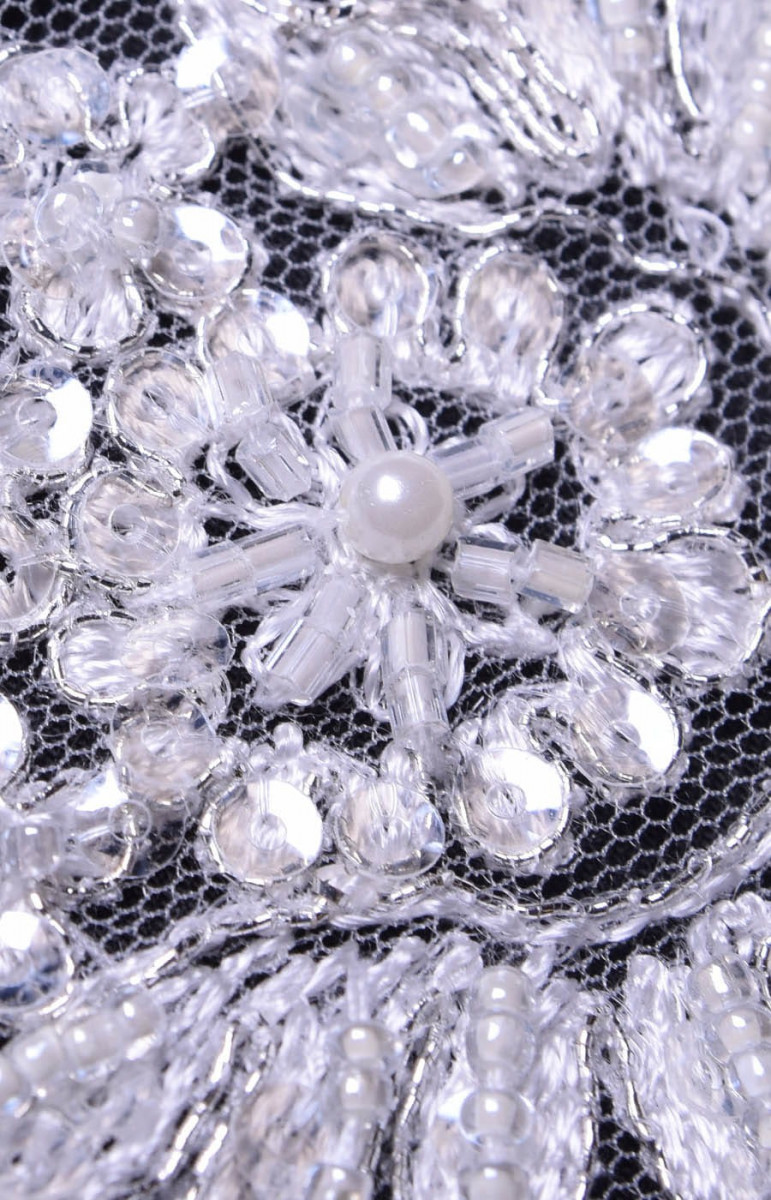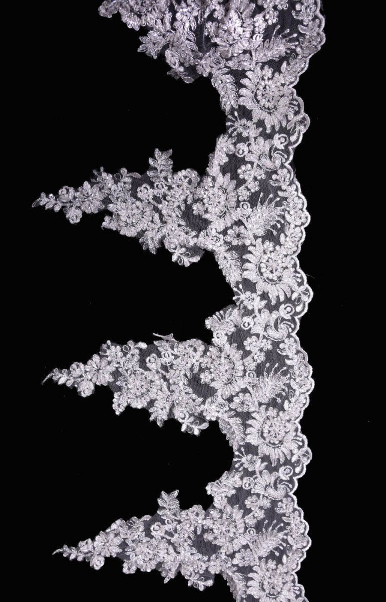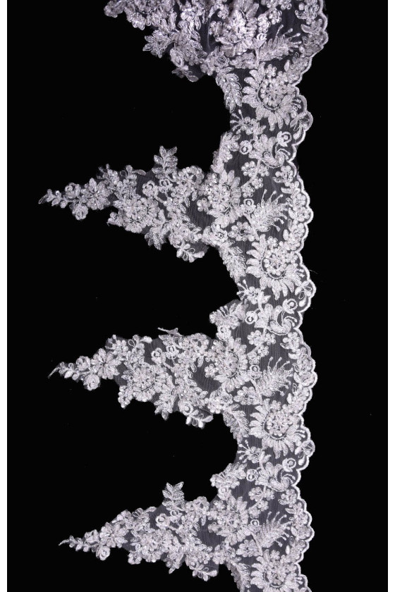 Bande de dentelle de couleur crème brodée de pierres et de paillettes. Tissu fini d’un côté avec une dent. Parfait pour finir les robes de mariée.