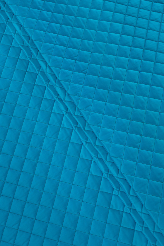 Tissu de veste italienne avec un motif matelassé (5cm) - double face, d’un côté en bleu sarcelle et de l’autre en kaki. Le tissu est rempli d’isolant en polyester.