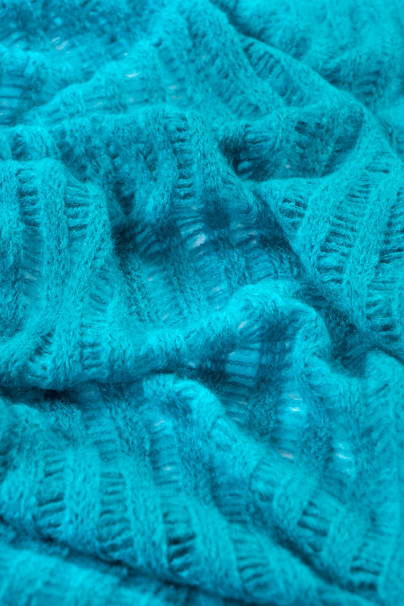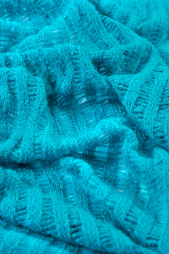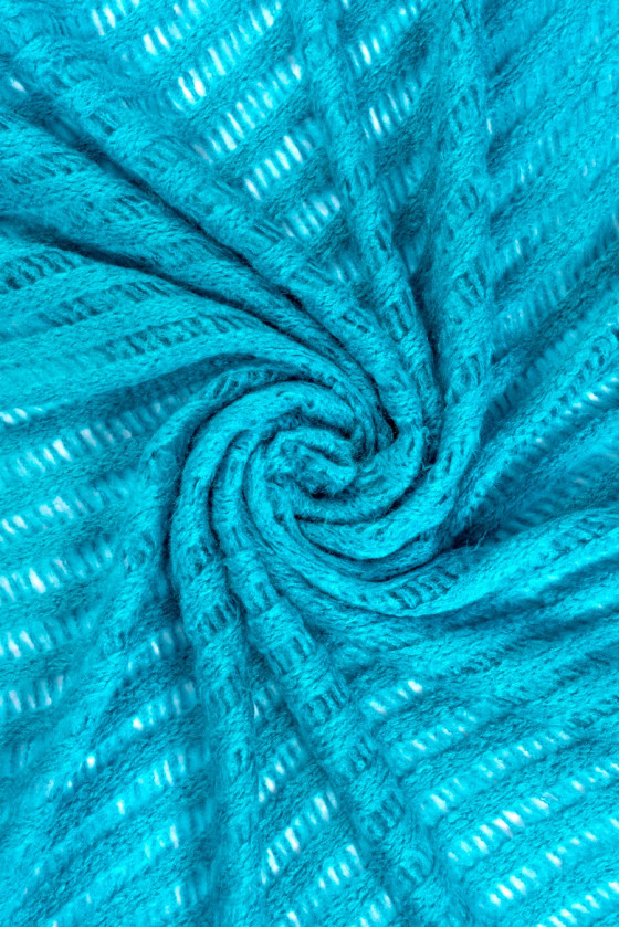 Tissu tricoté italien de très bonne qualité. Doux, moelleux avec un tissage ajouré lâche. Parfait pour coudre un pull ou un col roulé. Composition : 75% PC, 25% CA. Couleurs : turquoise.