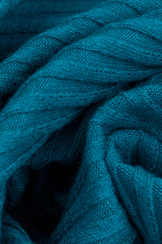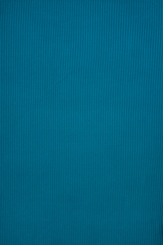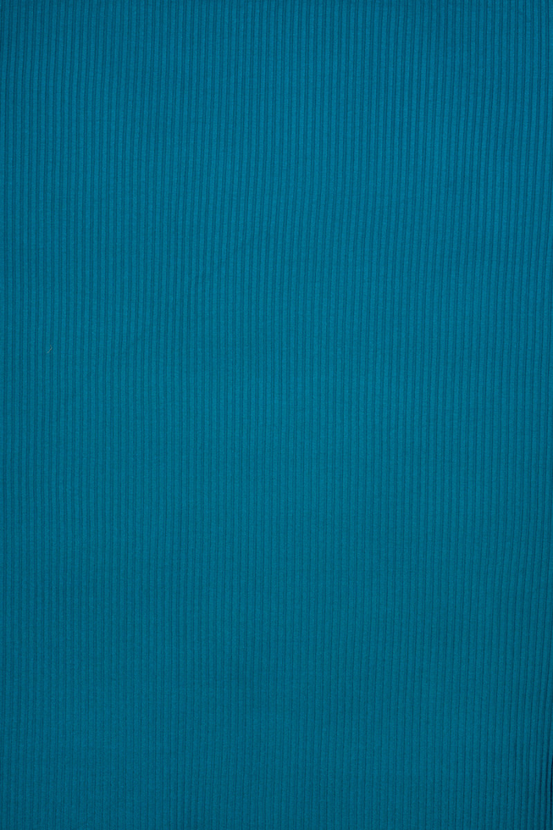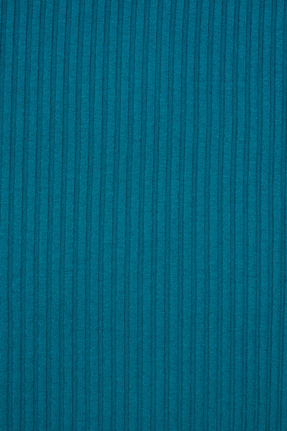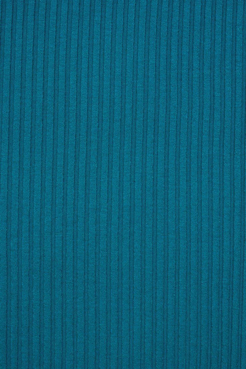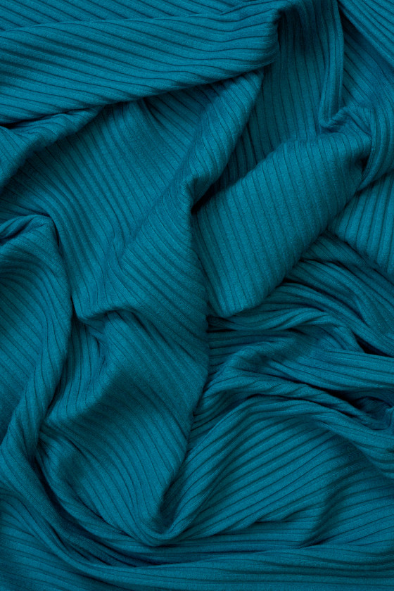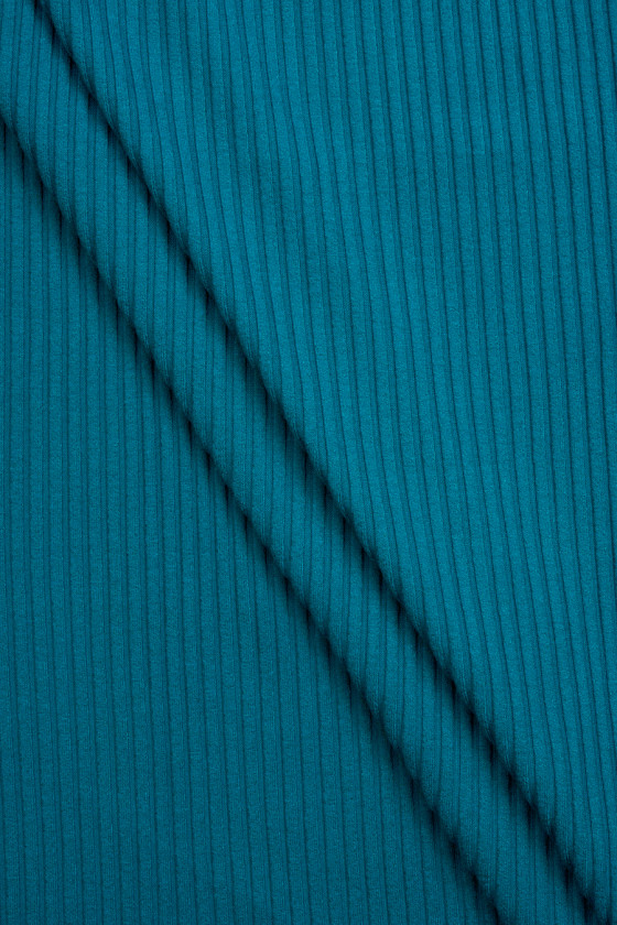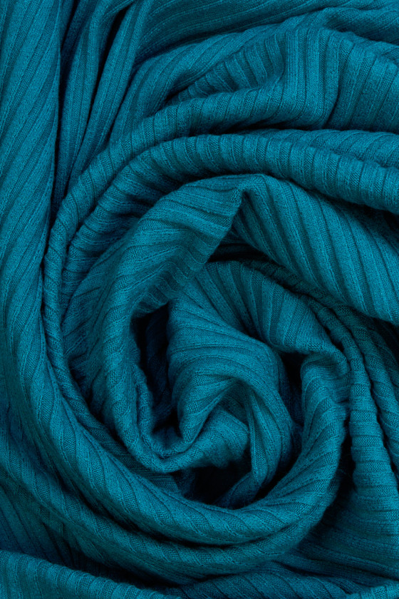Tissu tricoté italien avec un tissage côtelé large (0,5 cm) de couleur sarcelle. Le tissu tricoté est doux, très élastique, opaque, agréable au toucher.