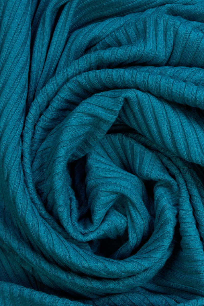 Tissu tricoté italien avec un tissage côtelé large (0,5 cm) de couleur sarcelle. Tissu tricoté doux, très élastique, opaque, agréable au toucher - parfait pour coudre une robe, une jupe ou un chemisier.