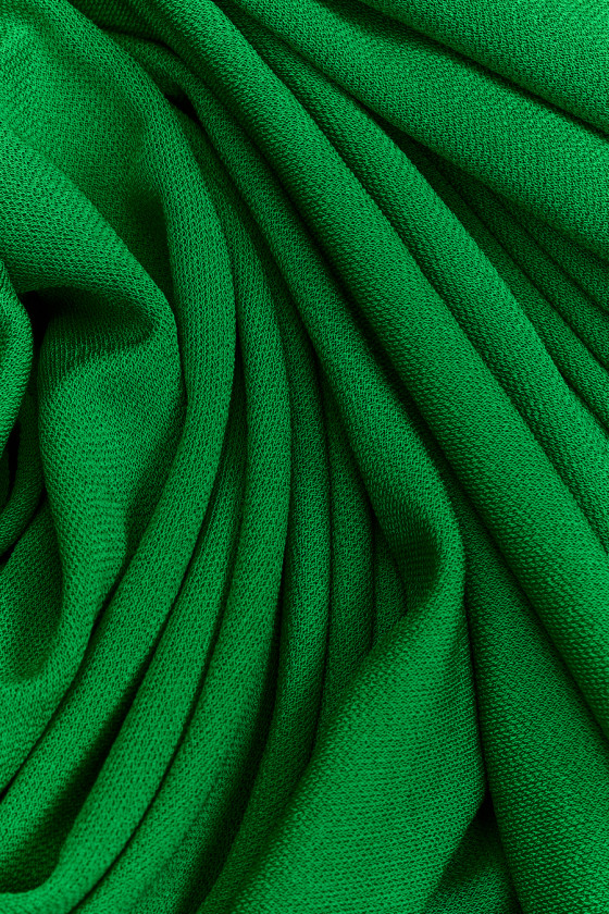 Tissu tricoté en viscose italienne avec un tissage georgette verte. Le tissu est mat, charnu, élastique, fluide et frais au toucher. Une excellente option pour les vêtements d’été, tels que les robes, les jupes ou les chemisiers, fonctionnera bien pour les vêtements ajustés.
