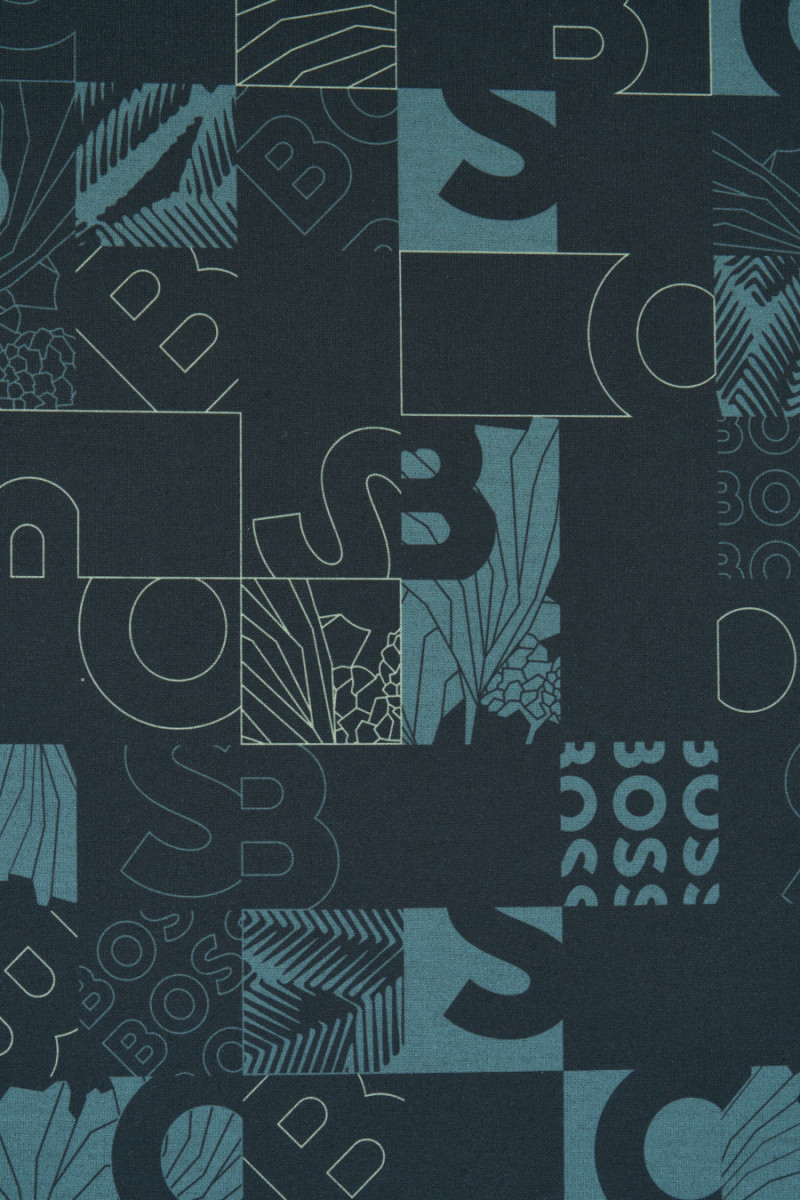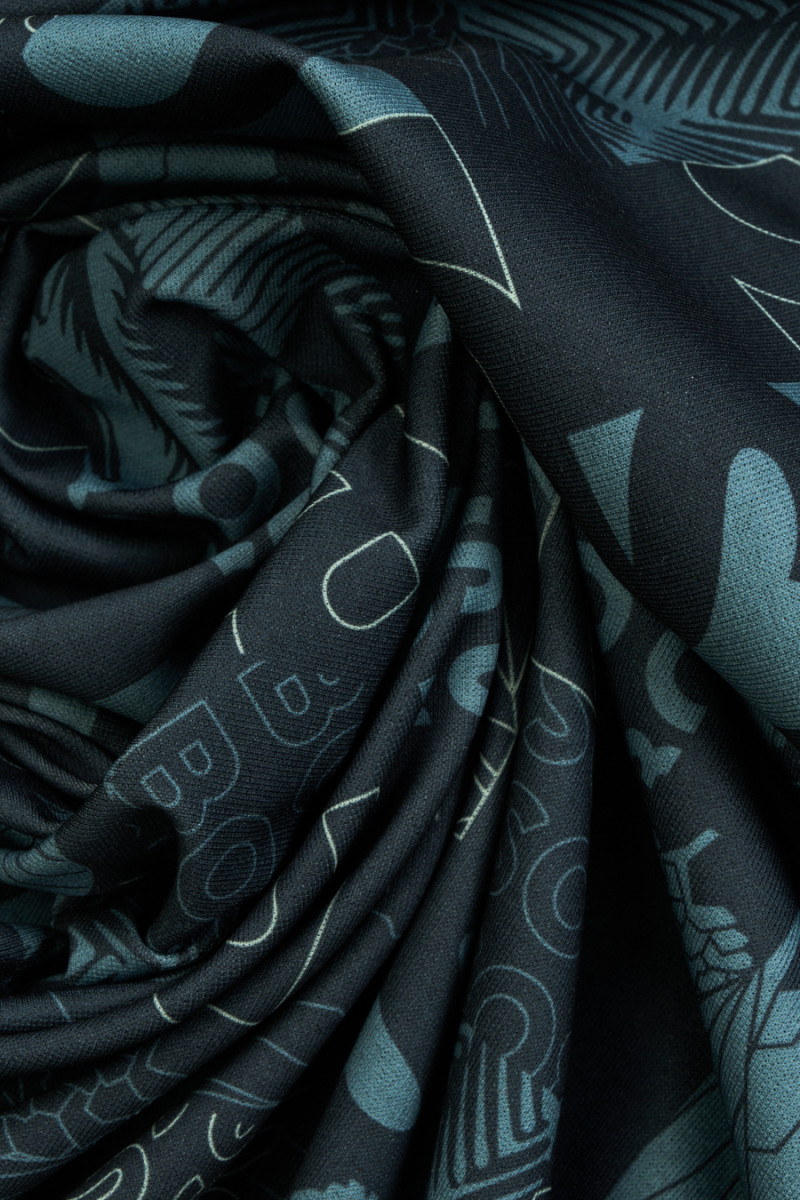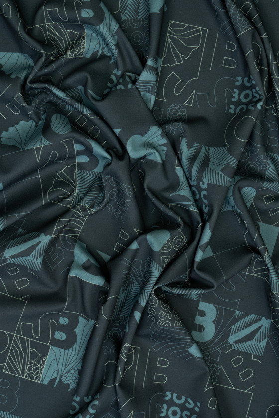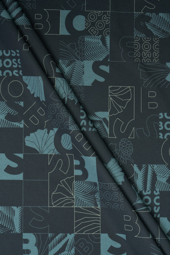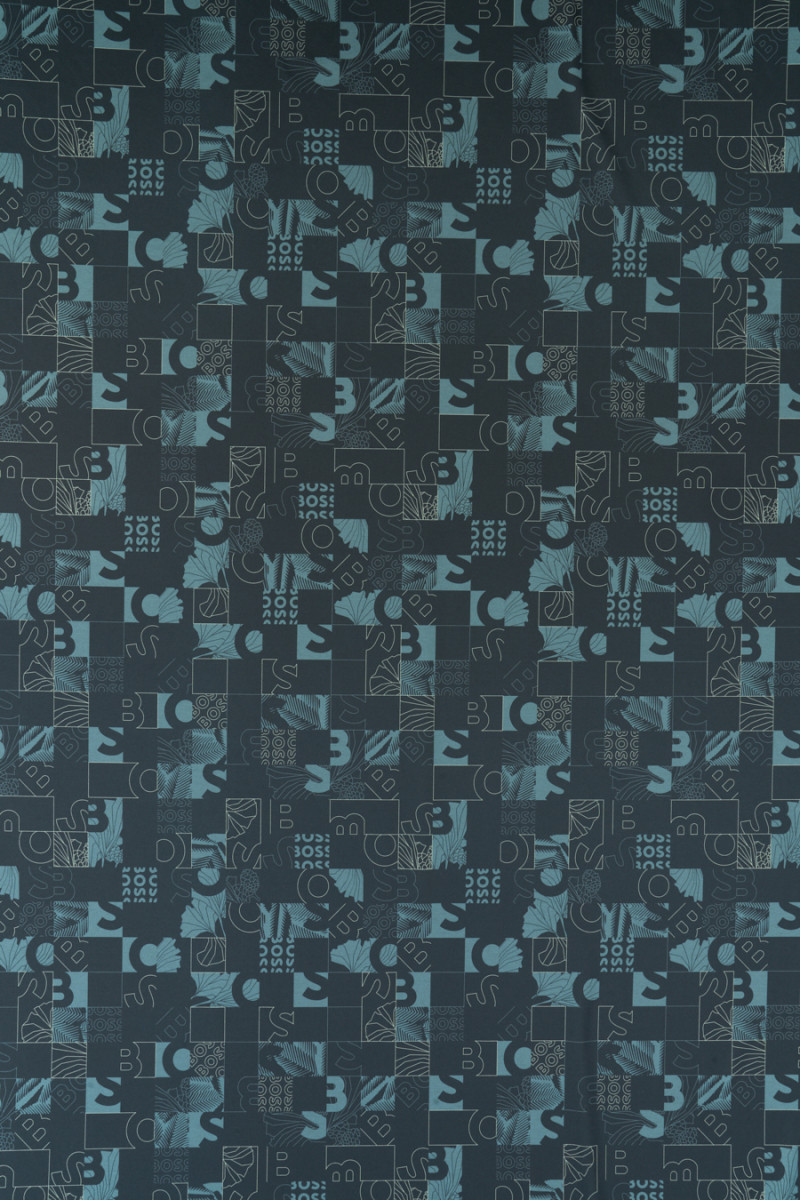 Tissu jersey de viscose italien avec un motif d’inscriptions et de lettres placées en carrés. L’ensemble est conservé dans des couleurs calmes - graphite, gris-bleu. Les carrés ont une taille de 5 cm * 5 cm, chacun d’eux a un motif placé - lettres, feuilles, tirets. Le tissu tricoté est opaque avec un tissage dense, élastique, légèrement drapé et charnu. Parfait pour les pantalons, les vestes, les sweat-shirts.