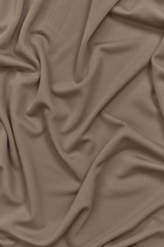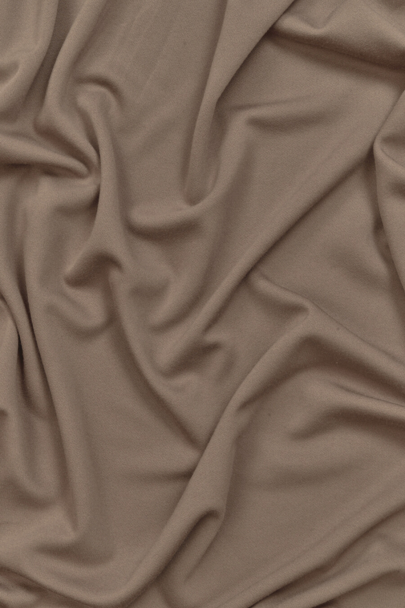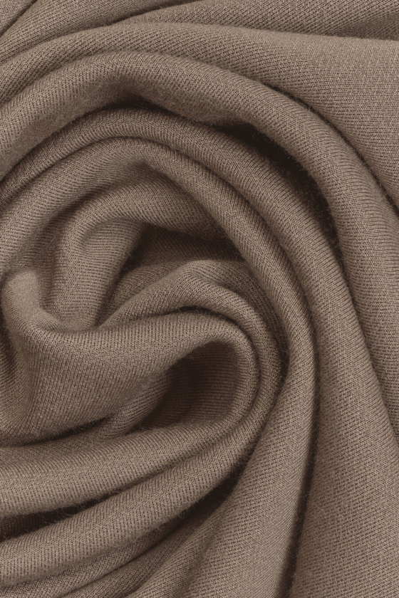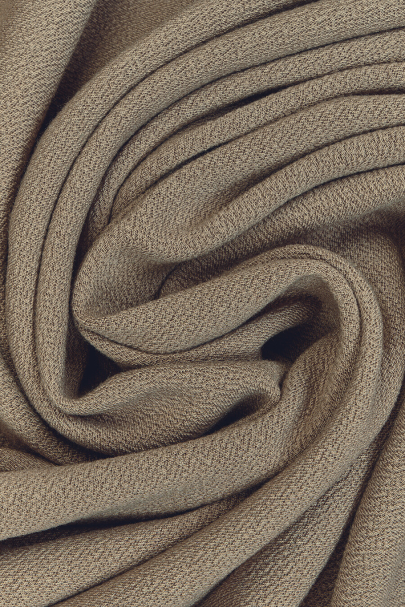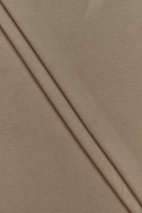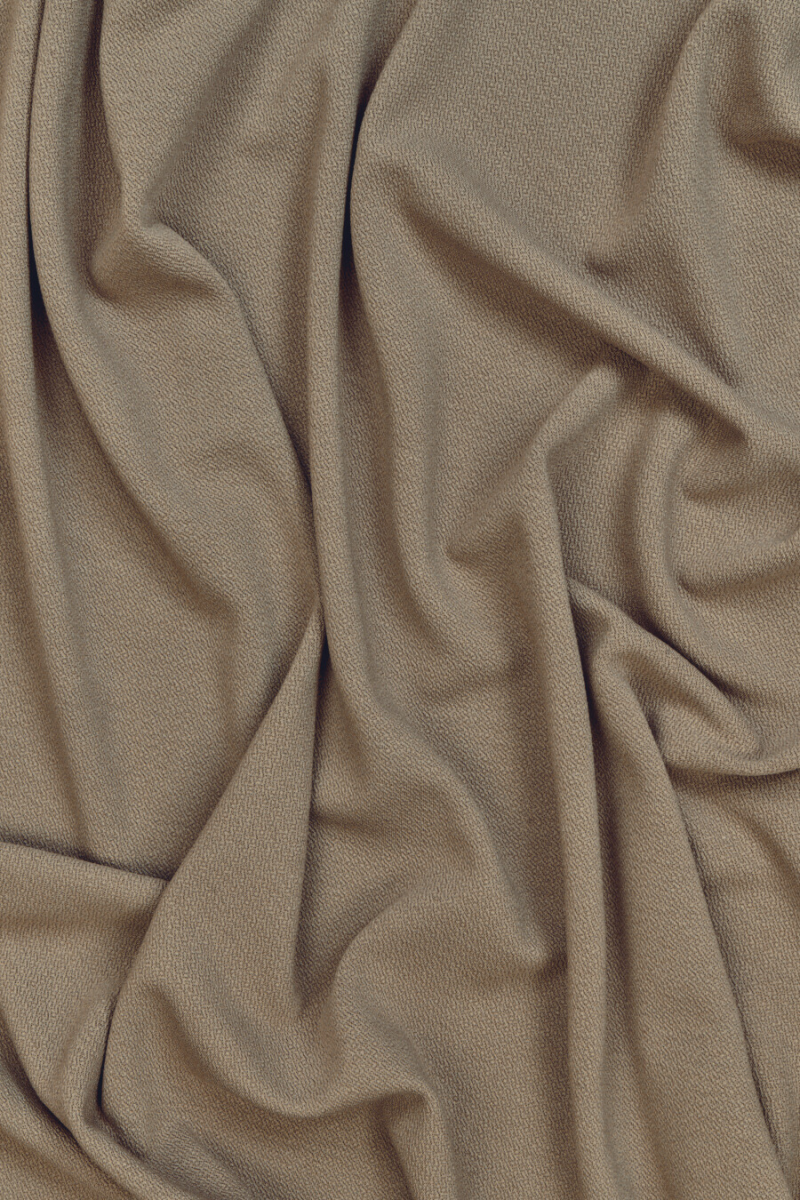 Tissu tricoté italien en polyester beige pierre foncé. Le tissu tricoté est double face - un côté a une structure fine et ondulée, l’autre a un tissage lisse. La matière est charnue, élastique, mate et douce. Il fonctionnera bien pour coudre une robe, une jupe, ainsi qu’un pantalon ou un sweat-shirt.