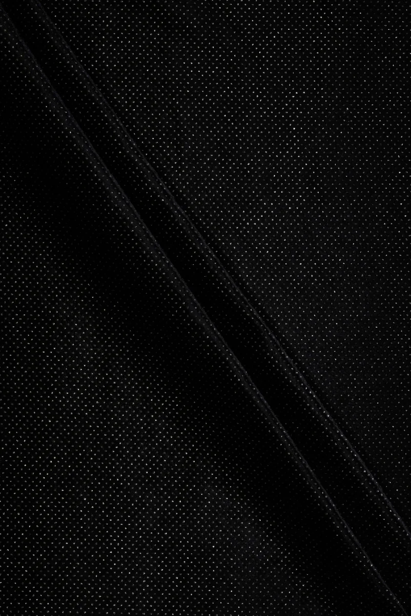 Velours de coton noir avec un motif de petits points, densément et régulièrement posés et faits de fil d’argent. Le matériau est d’épaisseur moyenne, non élastique, opaque et possède un éclat magnifique. Il s’ajuste bien tout en gardant sa forme. Des motifs brillants donnent au tissu une brillance qui sera parfaite dans des tenues comme vestes, robes et pantalons. Il sera aussi parfait pour des fins décoratives, par exemple pour coudre un coussin.